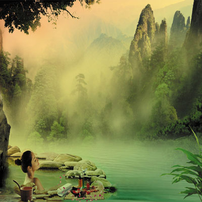 腳先入池坐在池邊,深處雙腳慢慢浸泡,然后用手不停地將溫泉水潑淋全身,最后時不時讓全身浸入到泉水中。